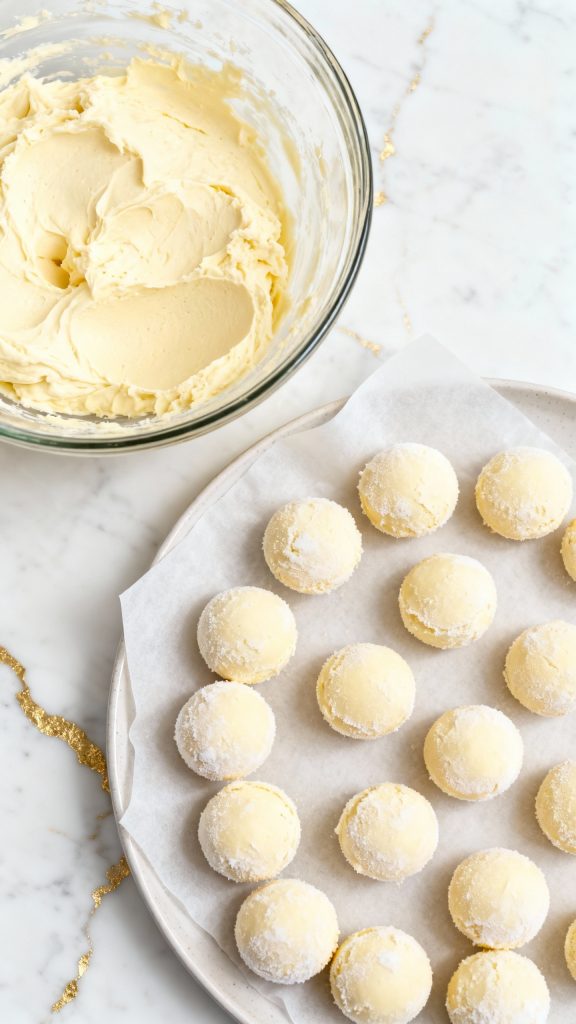 In a small bowl, mix 6 oz softened cream cheese, 1/4 cup granulated sugar, and 1/2 teaspoon vanilla extract until smooth. Scoop out 1 teaspoon portions and place them on a parchment-lined plate. Freeze for 20-30 minutes.