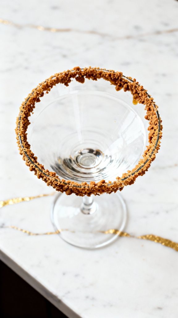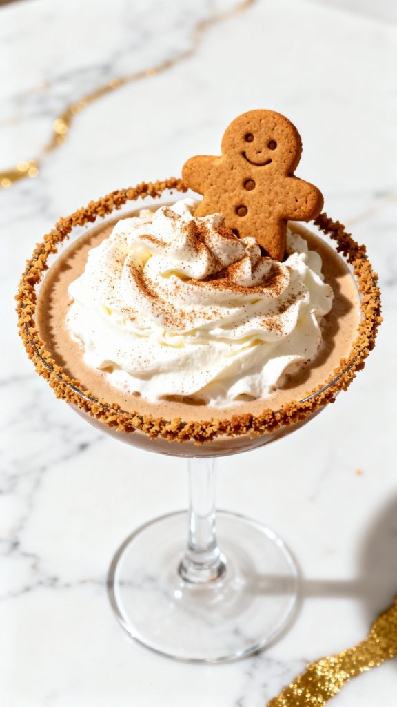 Take your martini glass and dip the rim into a bit of gingerbread syrup, then dip into crushed gingerbread cookies on a small plate until well coated.