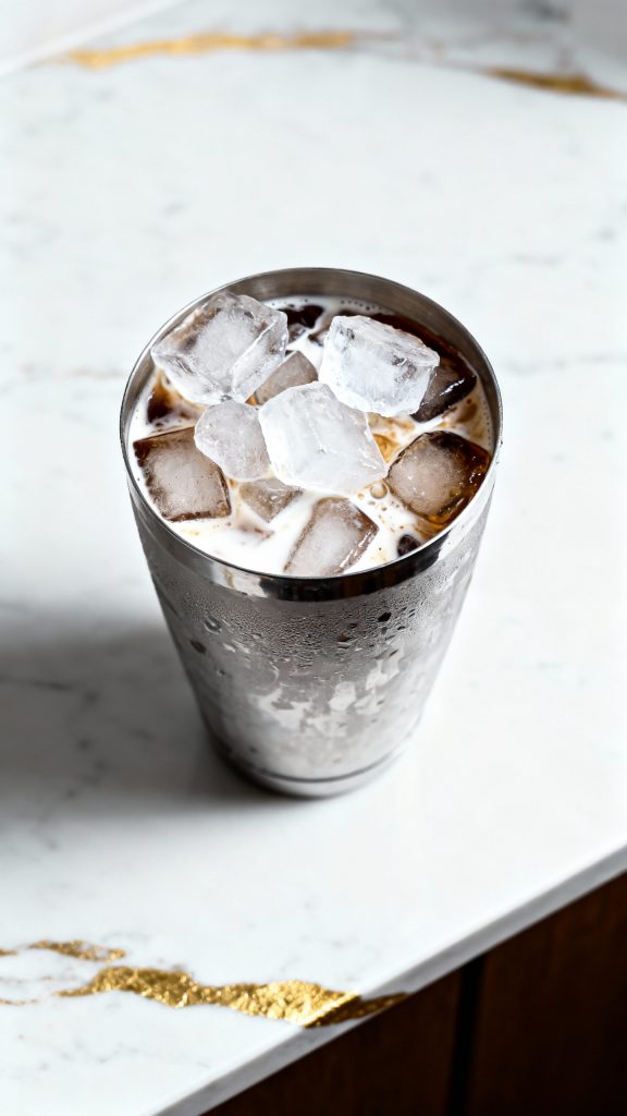 - Shake hard — you want it cold and creamy