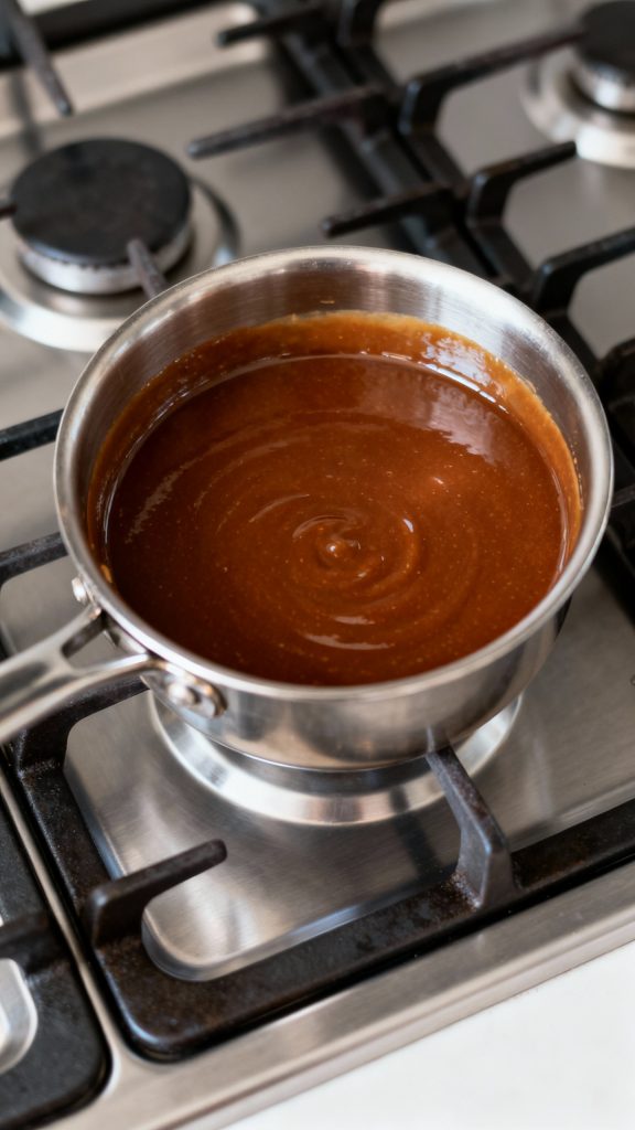 In a saucepan, melt ½ cup butter, then stir in 1 cup dark brown sugar, 1 cup heavy cream, ¼ tsp salt, and 1 tsp vanilla. Simmer for 5–6 minutes until smooth and slightly thickened.