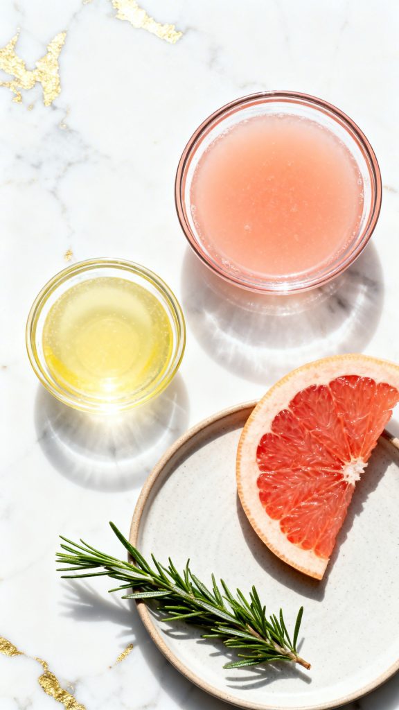 Juice enough grapefruit to get 2 ounces fresh grapefruit juice. Juice enough lemon to get 1/2 ounce fresh lemon juice. Slice 1 thin grapefruit wheel for garnish and set out 1 small fresh rosemary sprig.