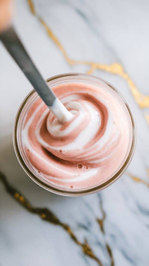 guava juice and coconut milk being stirred together in a clear jar, creating pale pink creamy swirls