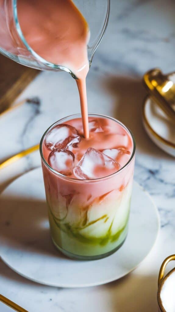 guava coconut milk tea being poured over ice in a tall glass, with creamy pink and green layers blending