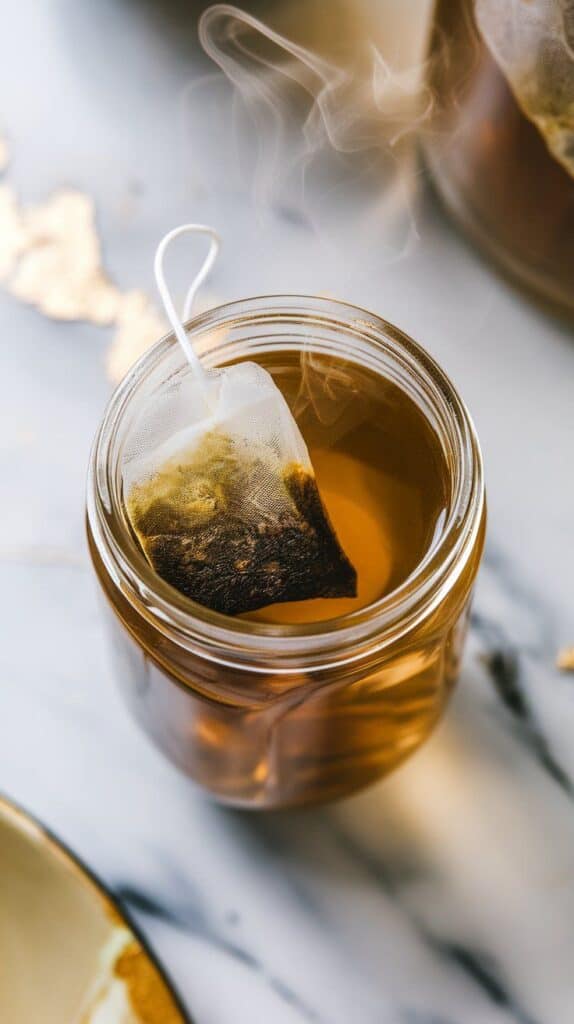 golden-green tea cooling in a clear glass jar, with the tea bag removed and soft steam fading