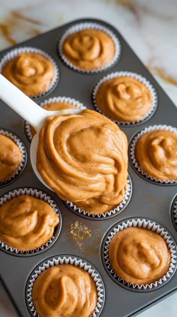 Divide batter evenly into prepared muffin cups, filling about 3/4 full.