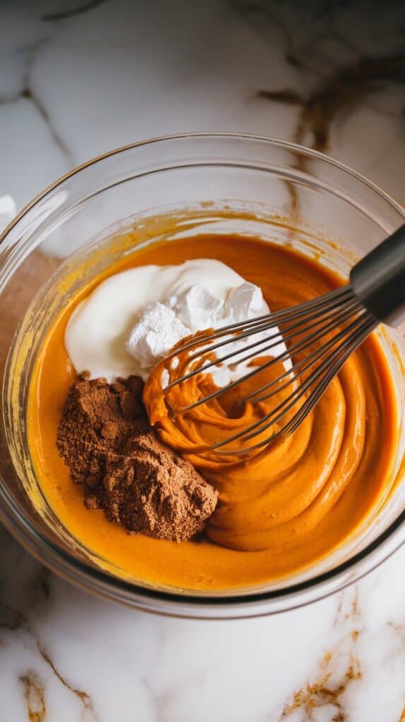 In a large mixing bowl, whisk together 1 cup pumpkin puree, 1 cup Greek yogurt, 2 large eggs, 1/3 cup honey, 1/4 cup packed brown sugar, 1/4 cup vegetable oil, and 1 tsp vanilla until smooth.