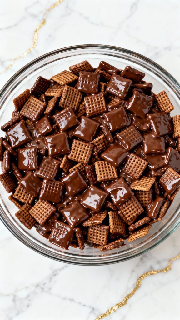 Pour the warm chocolate mixture over the cereal. Use a rubber spatula to gently fold it in, coating every piece without crushing the cereal.