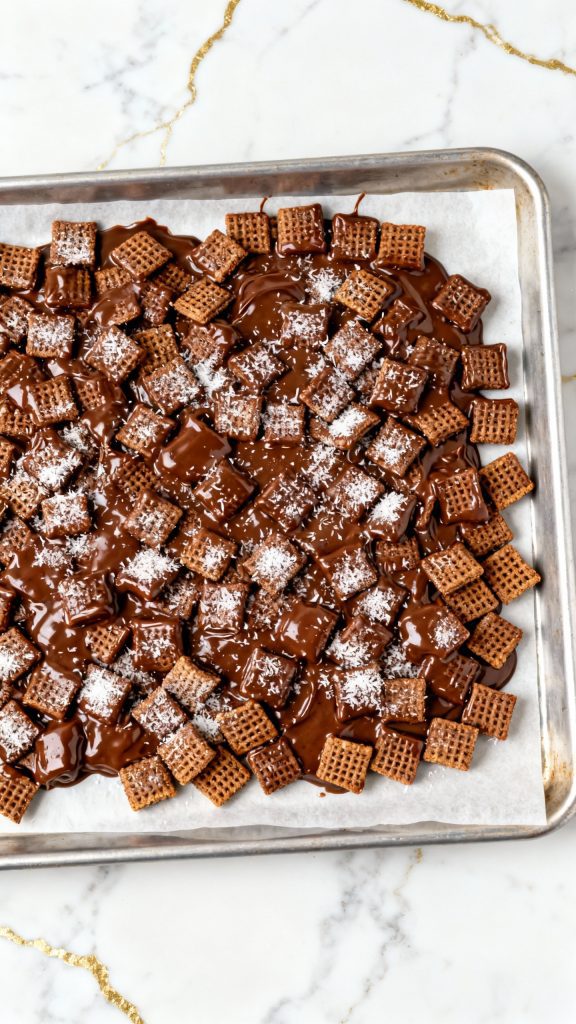 Spread Puppy Chow out on a baking sheet lined with parchment paper and let it cool for about 10 minutes to set.