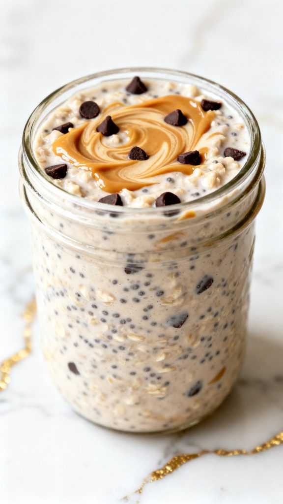I mixed a few things in a jar before bed and added chocolate chips because… why not? The next morning it tasted exactly like chilled cookie dough batter, but thick and creamy like pudding.