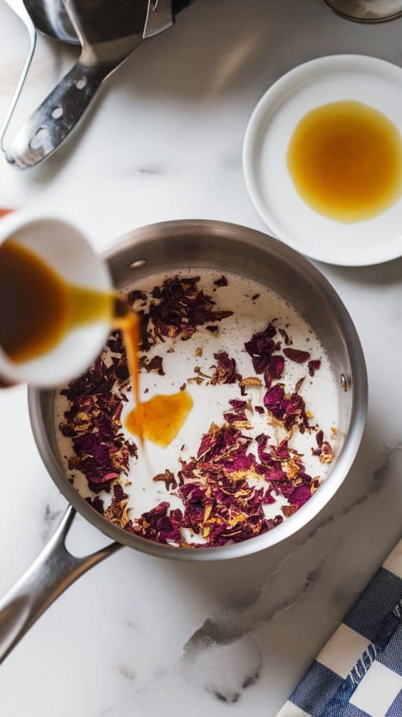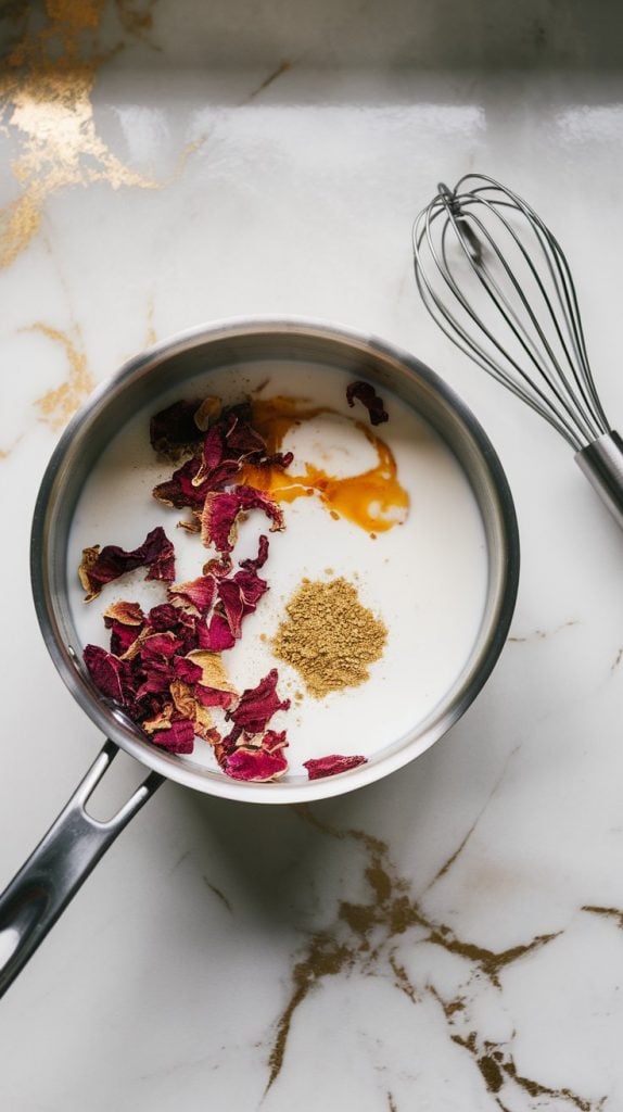 Add the milk, cream, honey, cardamom, and rose petals to a small saucepan.
