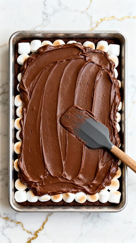 Pour the chocolate cream cheese mixture gently over the marshmallow layer. Spread it out evenly with a spatula.
