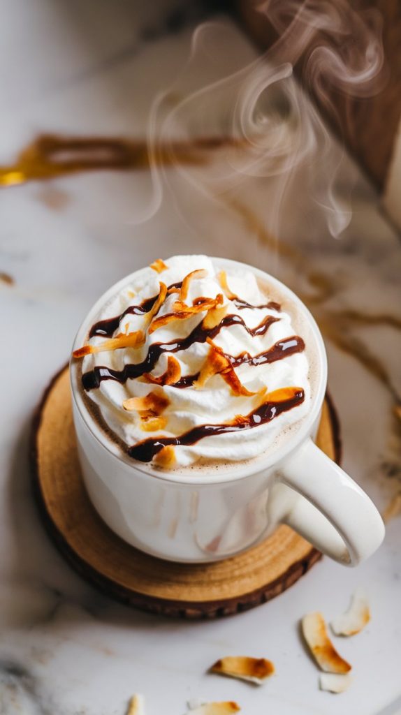 Pour the hot coconut mocha into mugs. Top with 1 tablespoon coconut whipped cream, 1/2 tablespoon toasted coconut flakes, and a light drizzle of chocolate syrup (if using). Serve hot.