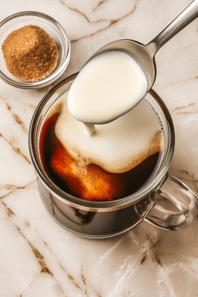 Hold a spoon over the coffee and slowly pour the whipped cream over the back of the spoon so it floats on top. Don’t stir!