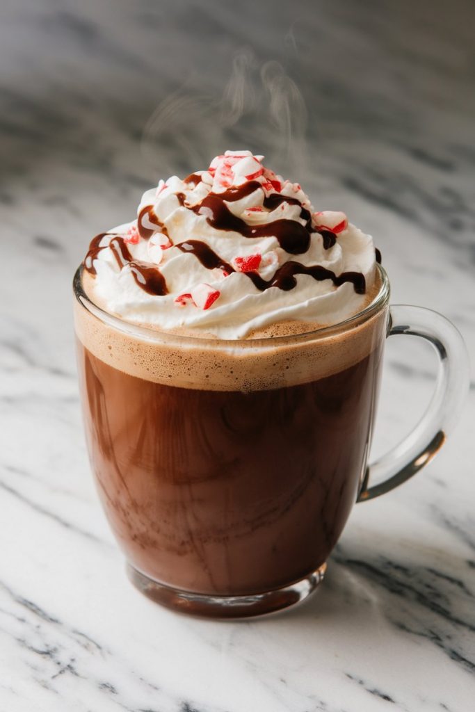 Pour the mocha into a mug. Top with whipped cream, a drizzle of chocolate syrup, and 1 tablespoon crushed peppermint candies.
