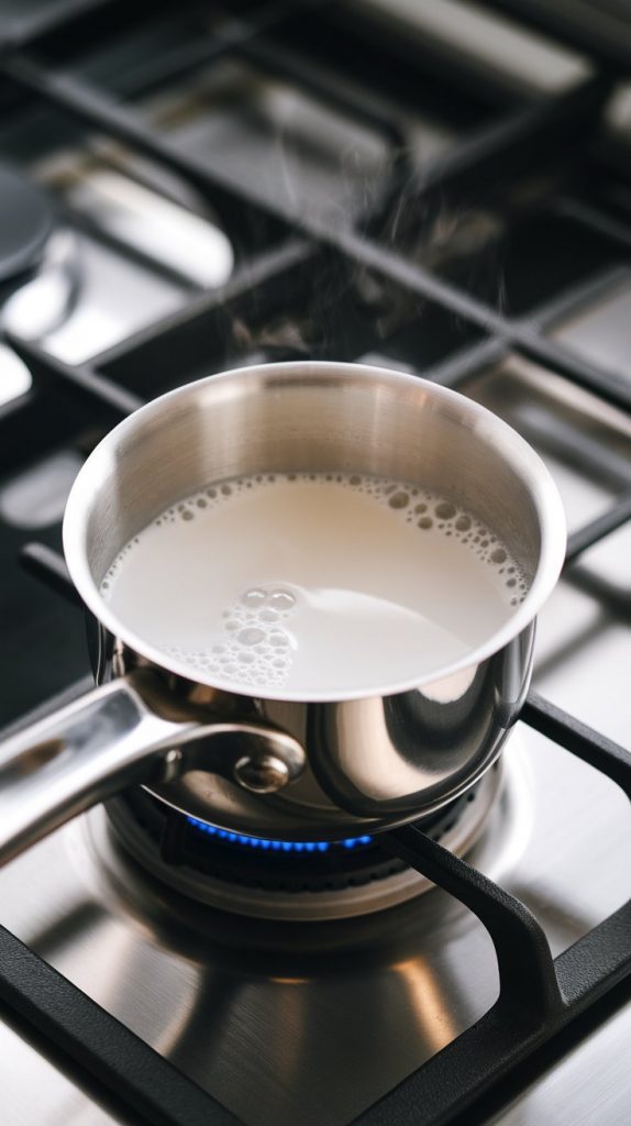 Add 1 cup whole milk to a small saucepan over medium heat. Warm it gently — do not let it boil.