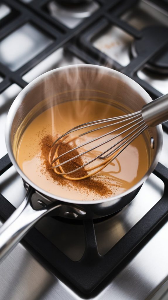 Add ½ teaspoon of pumpkin pie spice and ½ teaspoon of vanilla extract to the saucepan. Whisk again to blend everything together.