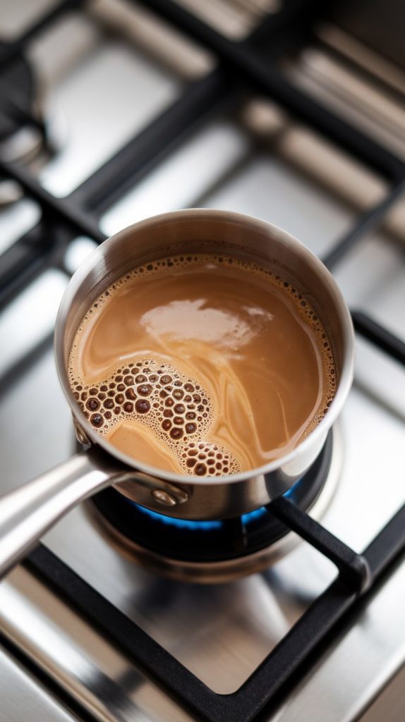 Now pour in ¼ cup of strong brewed coffee (or 1–2 shots of espresso). Stir well to combine. Let the whole mix warm through for another 1–2 minutes—don’t boil.