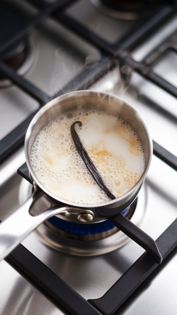 In a small saucepan over medium heat, combine 1 cup whole milk, 1 tablespoon granulated sugar, and the seeds plus pod from 1/2 split vanilla bean. Heat until steaming but not boiling, stirring occasionally.