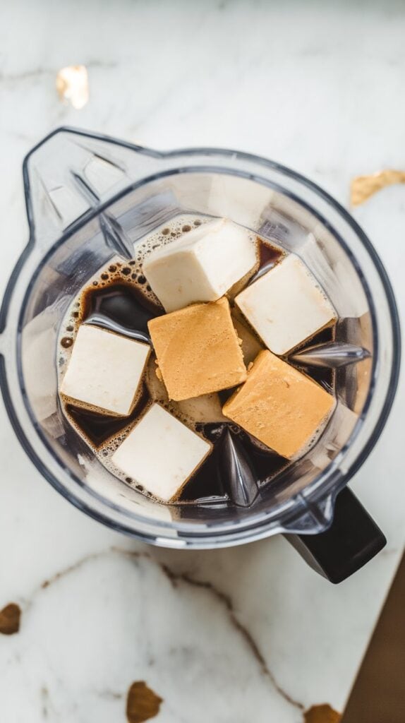 Add 1 cup cooled coffee, 1/2 cup milk, 1/4 cup Biscoff cookie butter, and 1 cup ice cubes to your blender.