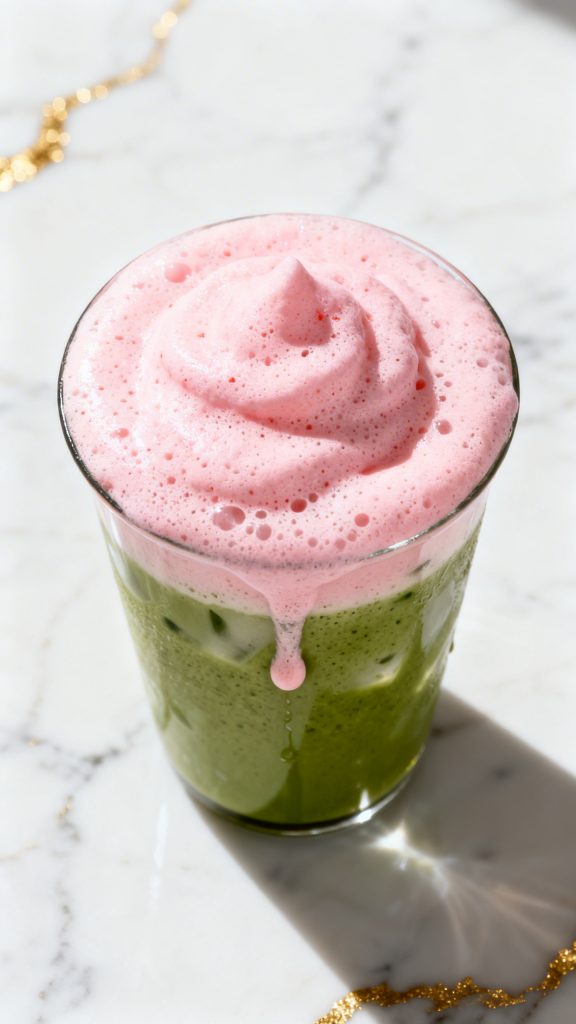 Spoon the strawberry cold foam on top of the matcha latte. Let it sit thick on the surface.