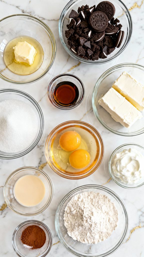 Cream cheese and eggs are the key players here. Eggs help firm up the cheesecake layer so it holds its shape, while sour cream keeps it silky. Irish cream has both alcohol and sugar, which adds richness and smoothness but also thins the batter just enough to make it easy to swirl. A bit of flour helps the bars stay together when sliced.