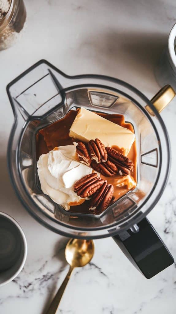 In a blender, combine heavy cream, butter, pecan butter, sugar-free caramel syrup, and vanilla extract. Blend until smooth and frothy.