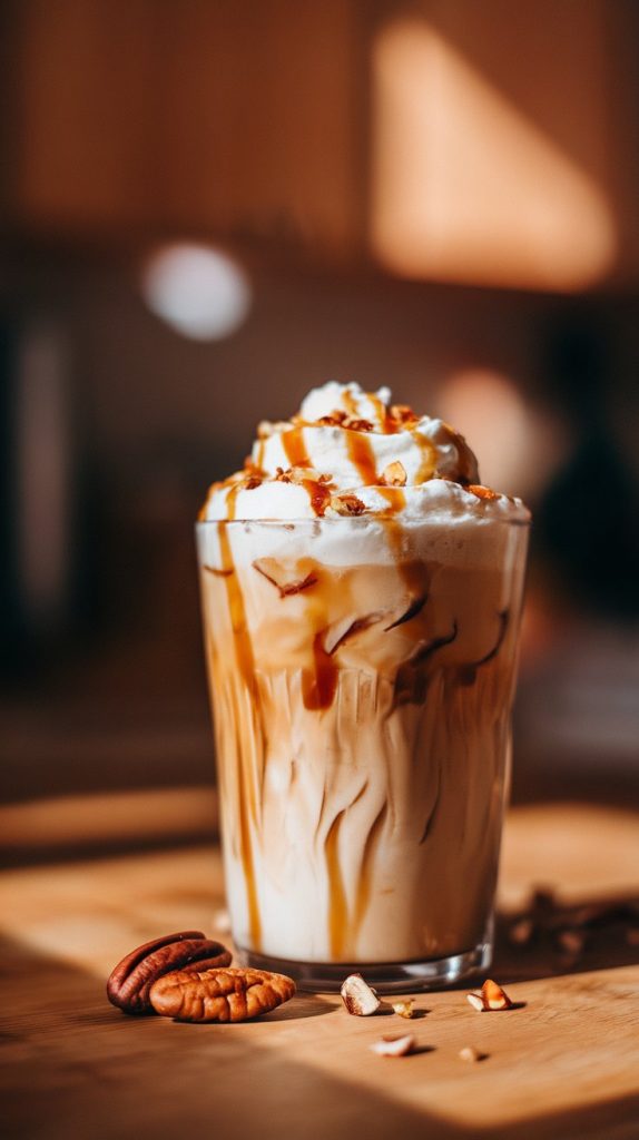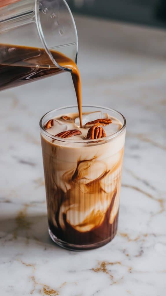 Fill a tall glass with ice cubes. Pour in your chilled coffee, then top it with the creamy pecan mixture. Stir gently to combine.