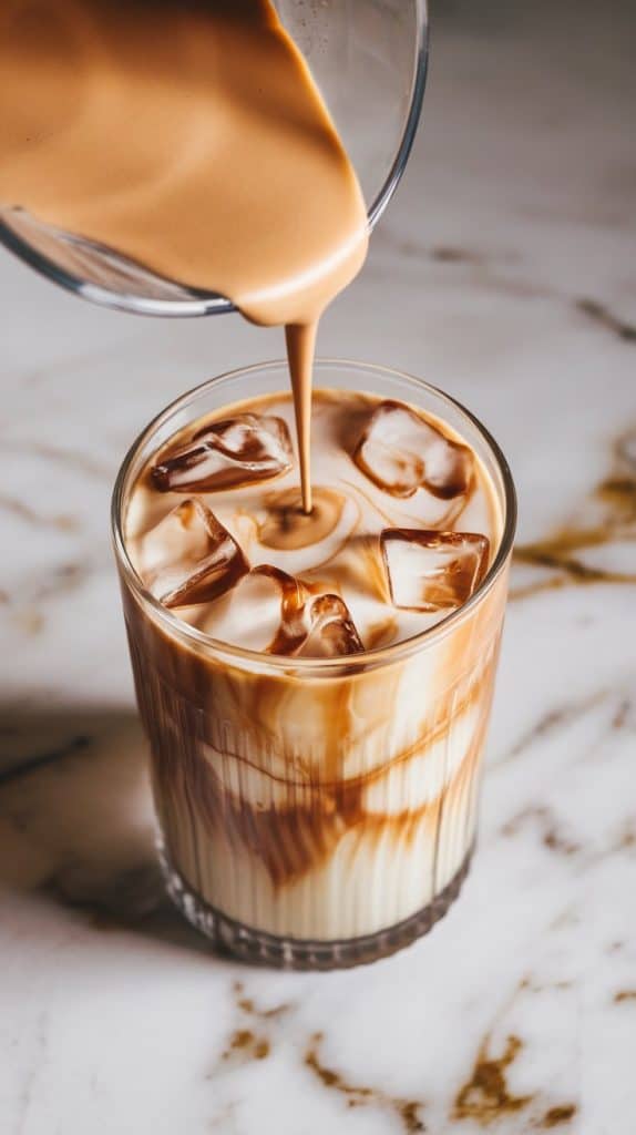 Fill a tall glass with ice cubes, then pour the creamy coffee mixture over the ice.