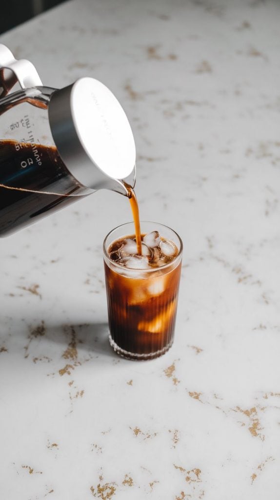Add your cold brew coffee to the glass, filling it until it’s just below the top of the ice.