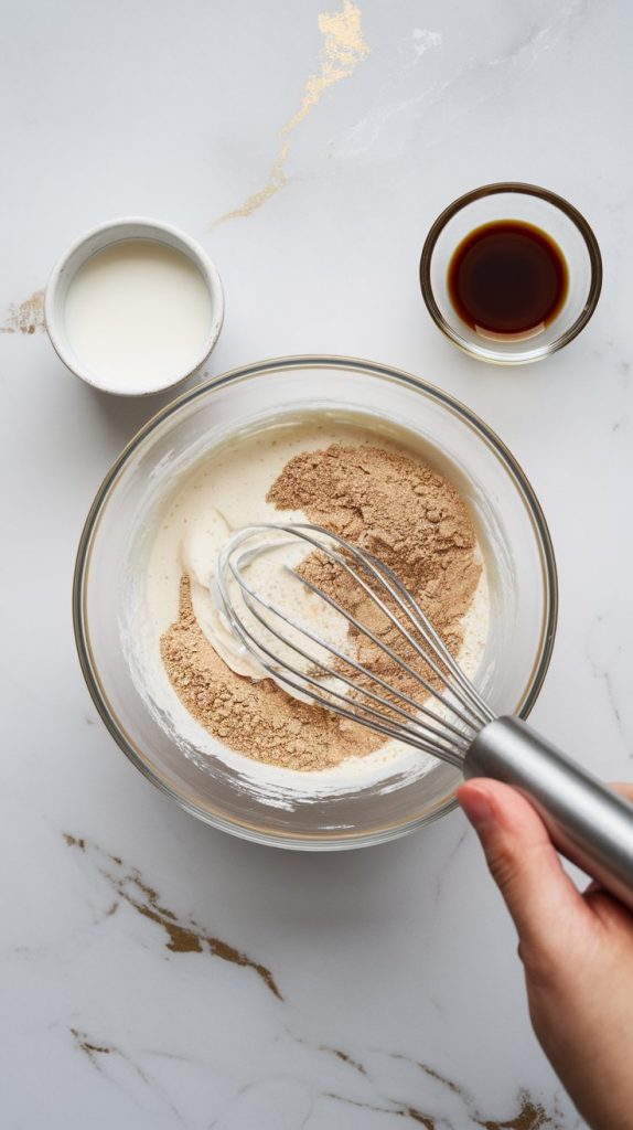 In a small bowl, whisk together the heavy cream, almond milk, vanilla extract, and powdered erythritol until smooth and slightly frothy.