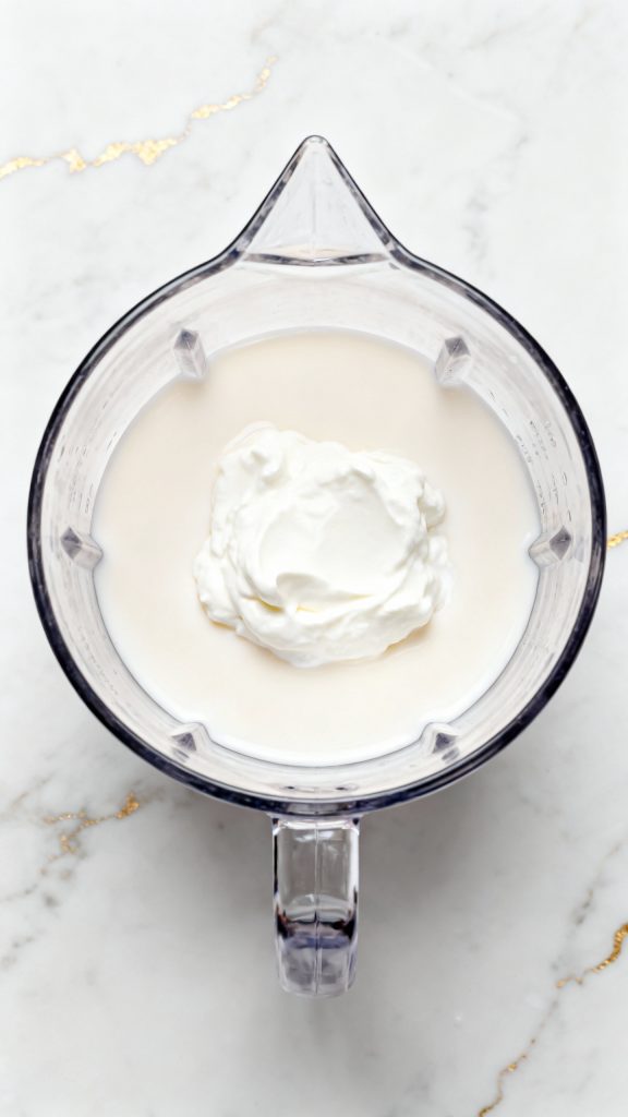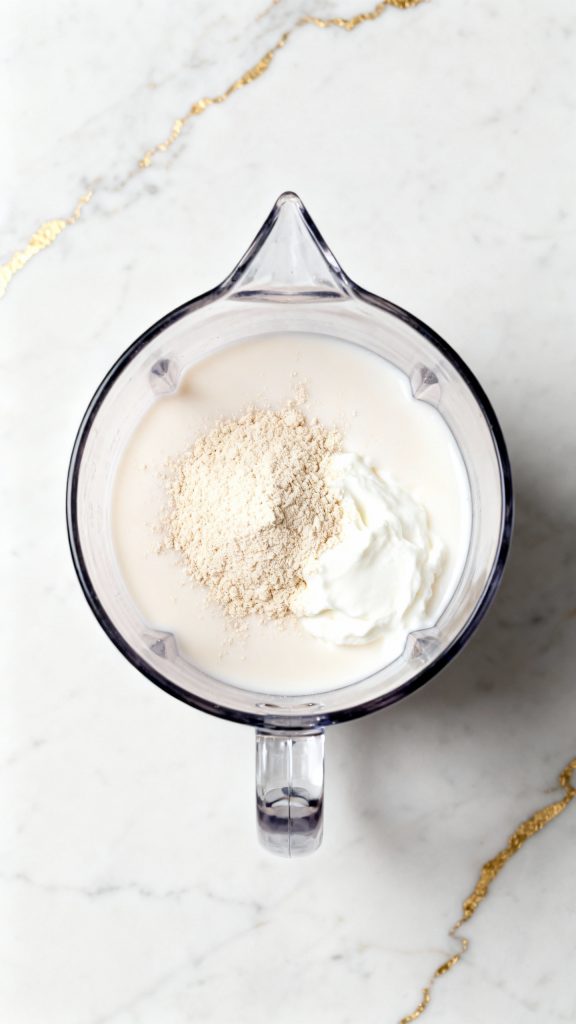 Pour 1 cup unsweetened almond milk and ½ cup nonfat plain Greek yogurt into the blender.