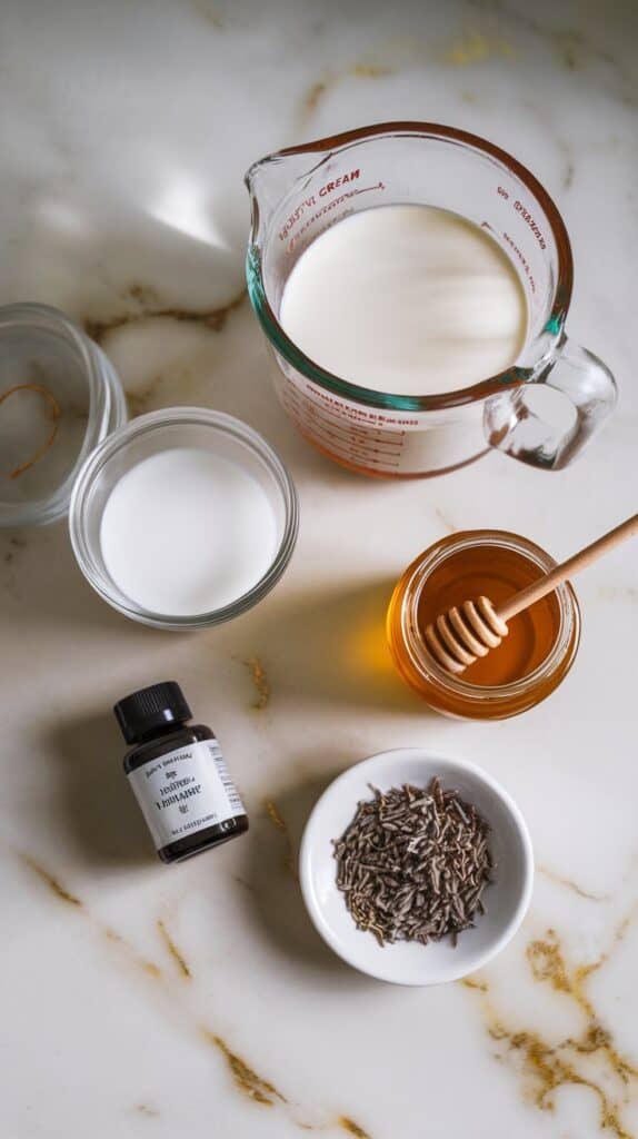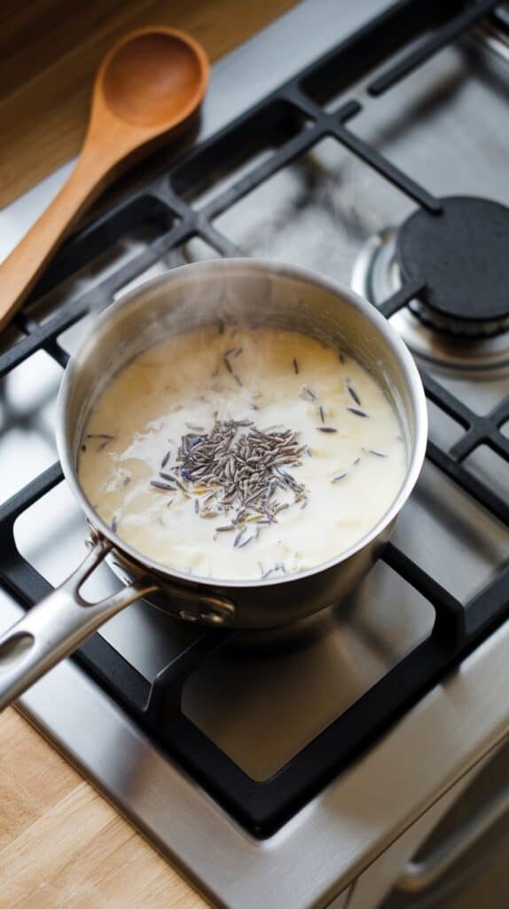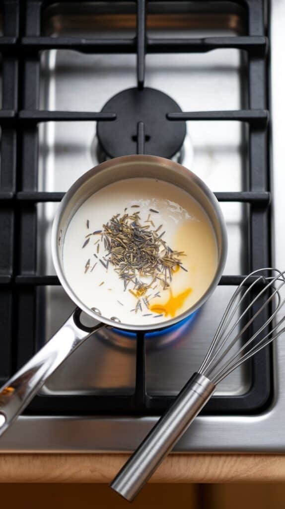 Pour the heavy cream, milk, honey, and dried lavender into a saucepan. Stir gently to combine.