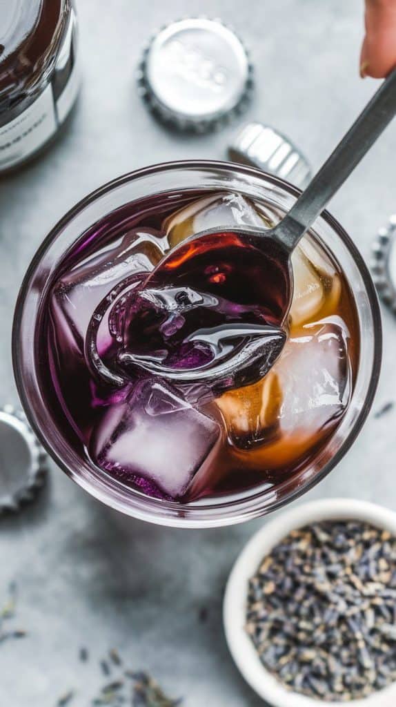 A super close-up, top-down shot of a bar spoon stirring vodka, coffee liqueur, and deep purple lavender syrup
