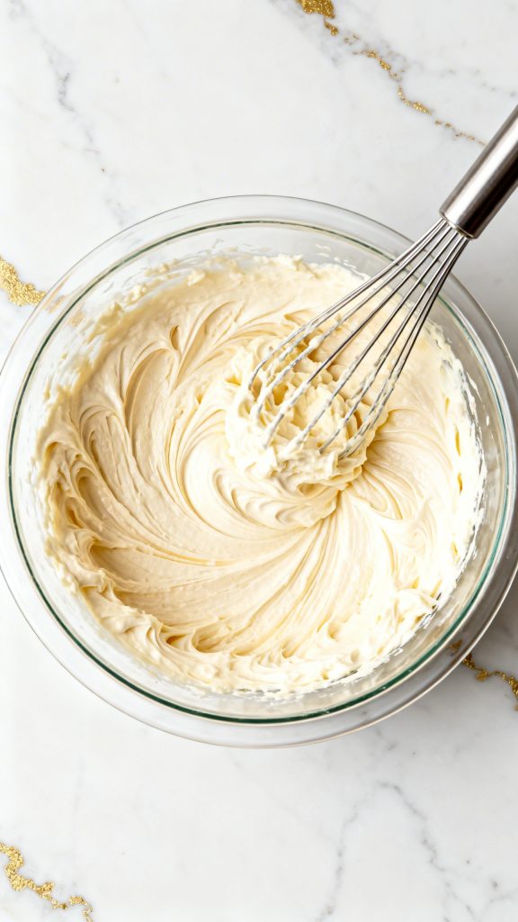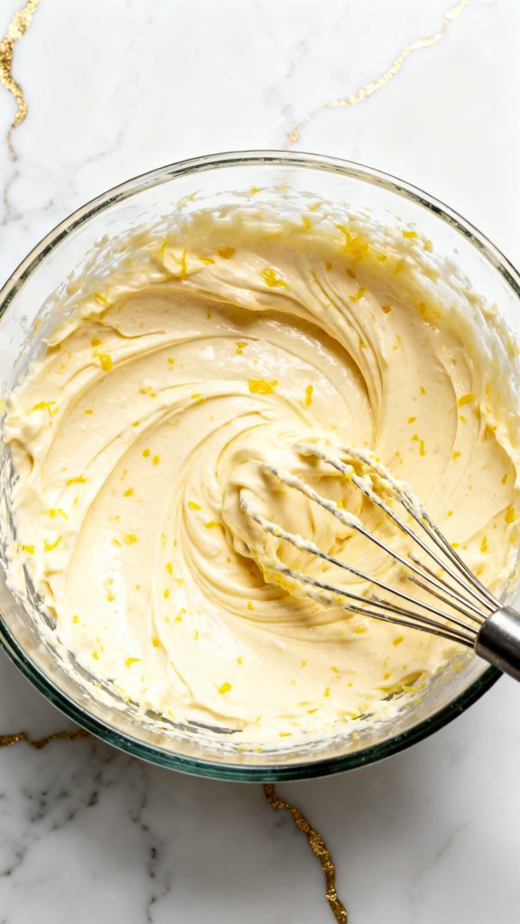 Add 1 tablespoon freshly grated lemon zest, 2 tablespoons fresh lemon juice, and 1/2 teaspoon vanilla extract to the creamy mixture. Stir until fully combined. The mixture will look pale yellow and smell bright and fresh.