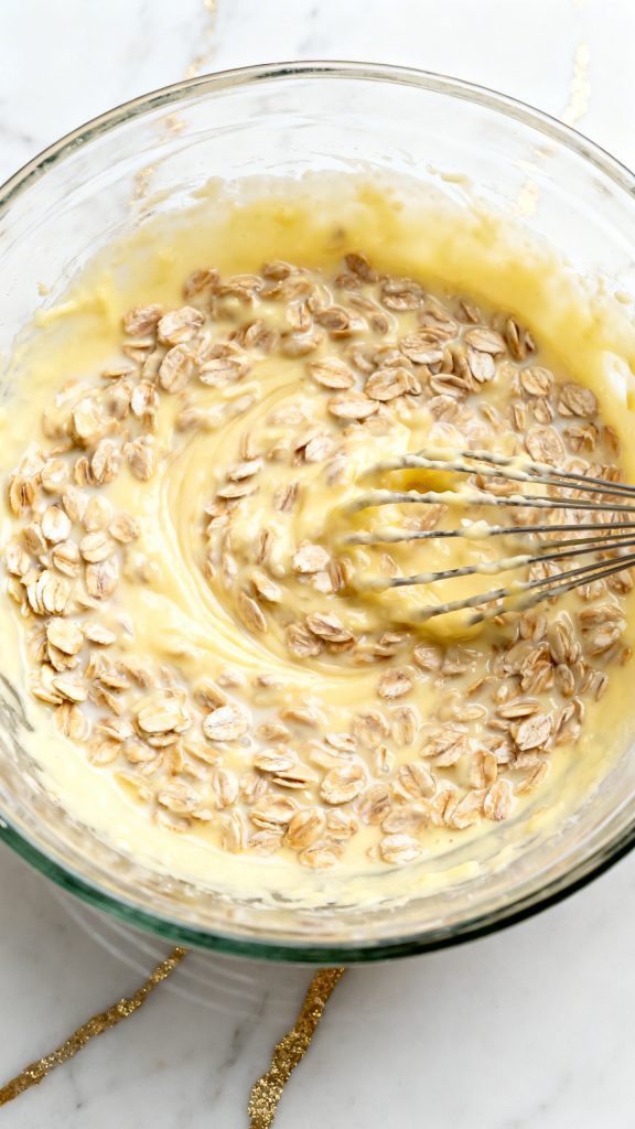 Add 1 cup rolled oats and 1 cup milk to the lemon cream mixture. Stir very well so all the oats are coated and soaked. The mixture will look loose and creamy.