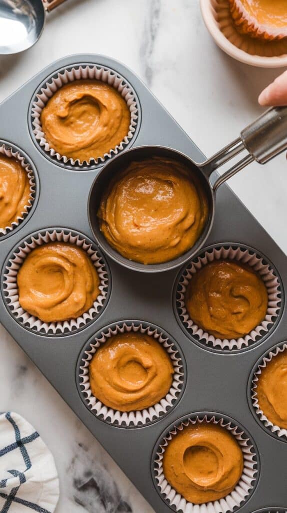 Line a muffin tin with silicone liners. Scoop the batter evenly into 9 cups using a spoon or scoop.