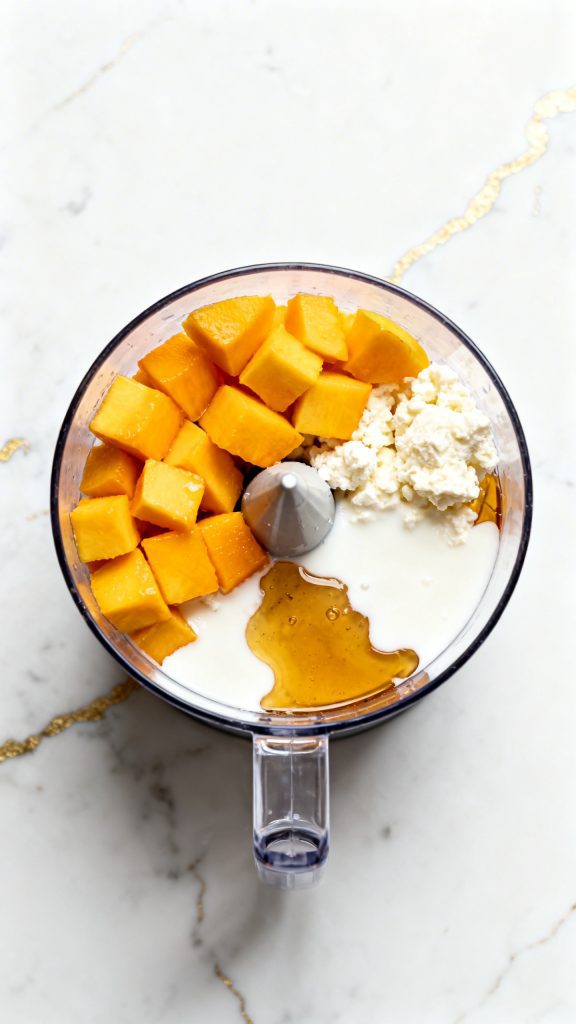 Add the diced mangoes, 1 cup full-fat cottage cheese, 1/3 cup canned coconut milk, 2 tablespoons honey, 1 teaspoon vanilla extract, and a pinch of salt into a blender.