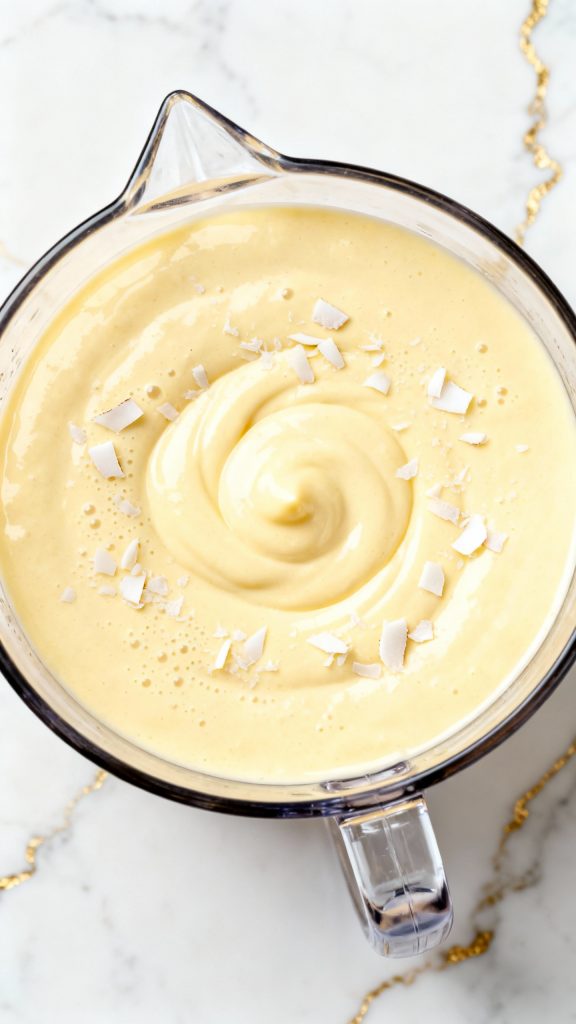 Pour into a glass and top with extra shredded coconut and a slice of mango.