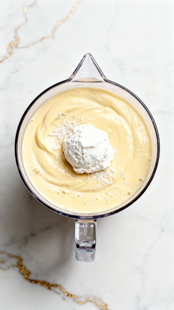 Any kind works—whey or plant-based—but vanilla gives it the best tropical flavor.