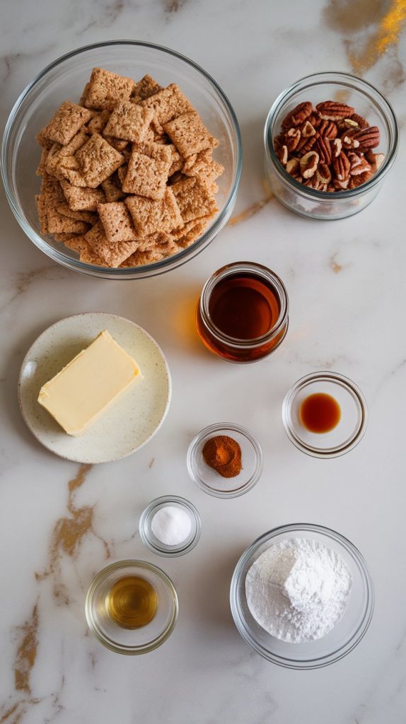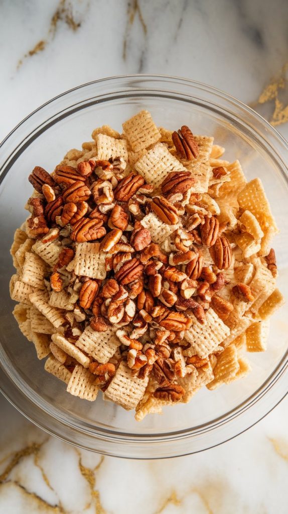 The maple syrup and butter create a sticky glaze that clings to every cereal square, thanks to sugar’s ability to caramelize quickly and hold. Cinnamon boosts flavor by enhancing sweetness without adding more sugar, and powdered sugar sticks perfectly because of the syrup-butter coating. Pecans add crunch and richness that balances the sweetness.