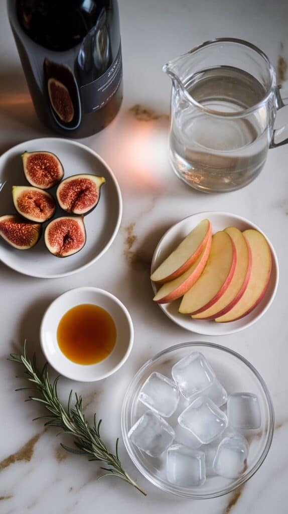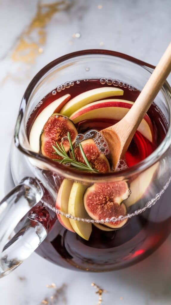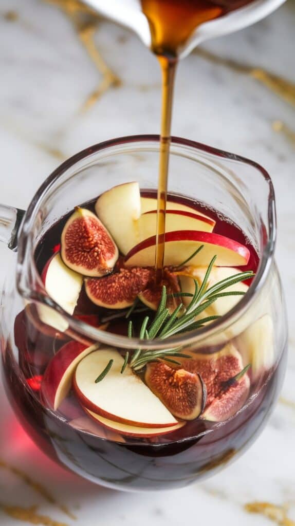 Maple Fig Red Sangria reminds me of fall nights by the firepit with friends. It’s simple, beautiful, and always impresses—without being fussy. The figs soak up the wine and get super flavorful. The maple syrup adds warmth without being overly sweet. And the rosemary? It makes it feel like something you’d get at a farm-to-table spot.