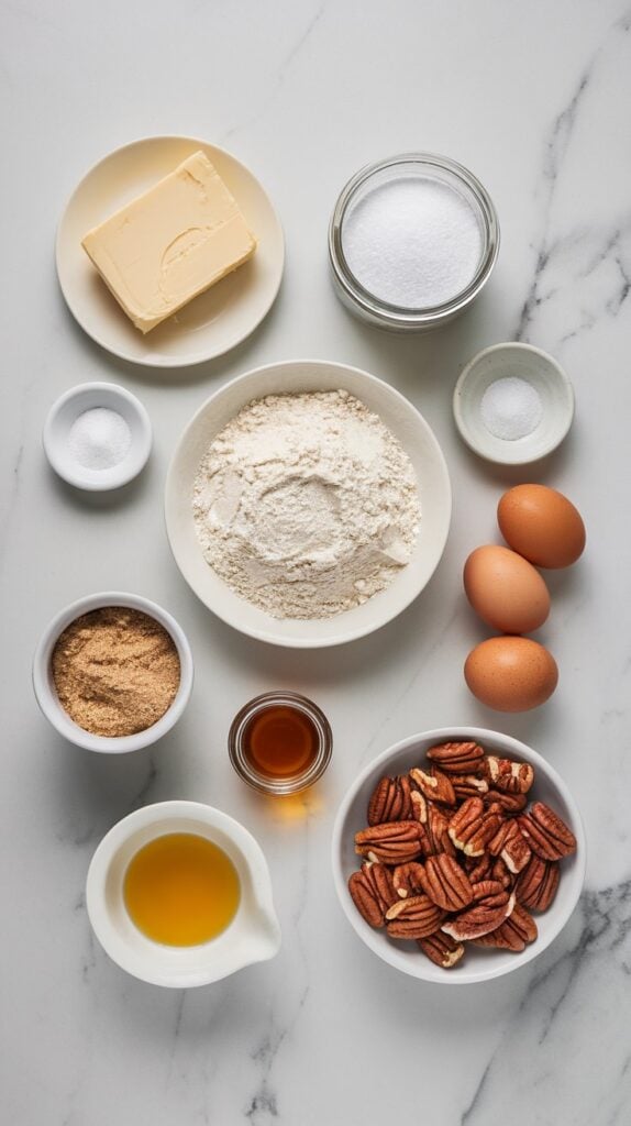 The shortbread crust acts as a sturdy base, thanks to the high butter content which sets firm when baked and cooled. The filling works like a classic custard—eggs thicken the maple syrup and sugar, which bake into a gooey yet sliceable topping. Pecans stay crunchy because they’re baked right on top, where they roast as the bars bake.
