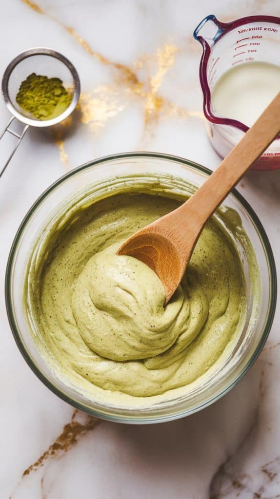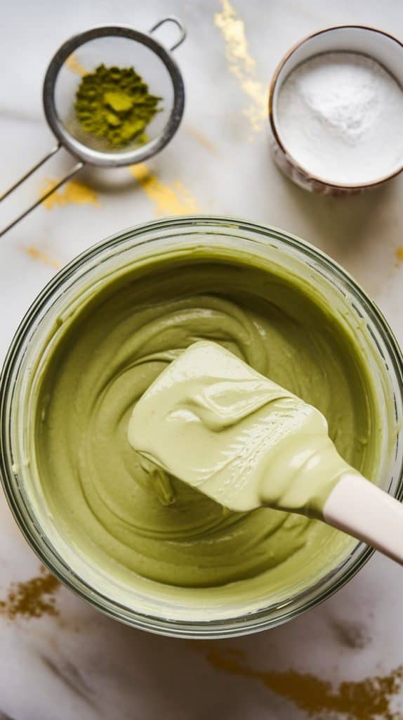 Mix softened cream cheese, powdered sugar, matcha powder, milk, and vanilla extract until smooth.
