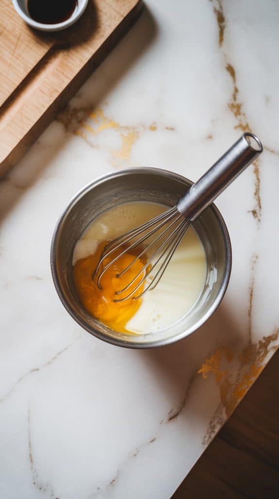 a small mixing bowl containing whisked egg, melted butter, milk, and vanilla extract, with a small metal whisk resting inside
