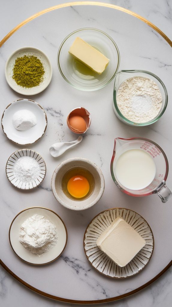 all the ingredients needed to make matcha baked donuts and matcha cream cheese glaze.