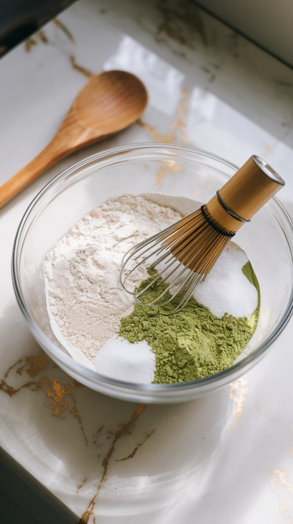 a glass mixing bowl filled with flour, baking powder, baking soda, matcha powder, salt, and granulated sugar, all freshly whisked together with a small metal whisk
