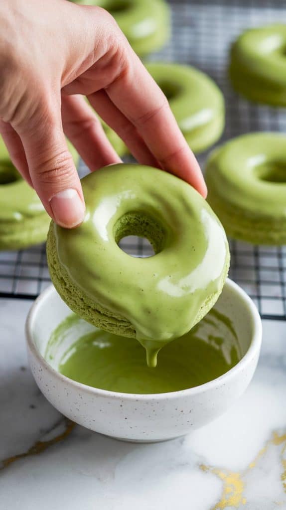 a hand dipping a freshly baked vibrant green matcha donut into a bowl of glossy matcha cream cheese glaze