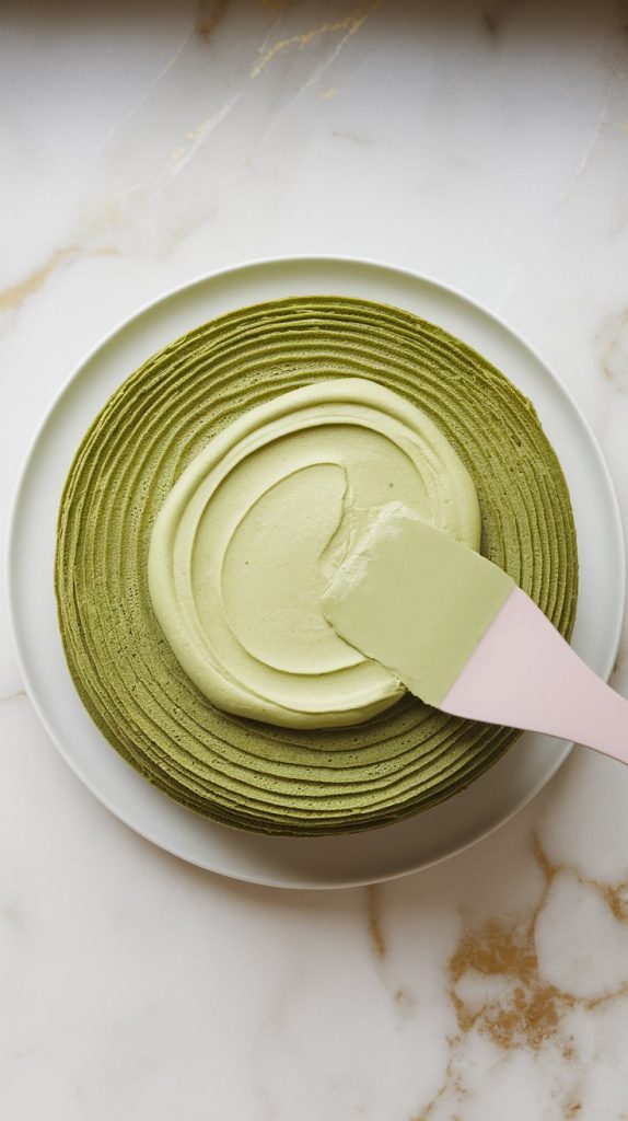 Place one crepe on a serving plate. Spread a thin layer of matcha whipped cream over it. Repeat the process, layering crepe and cream until all crepes are used. Refrigerate the cake for at least 1 hour to set.