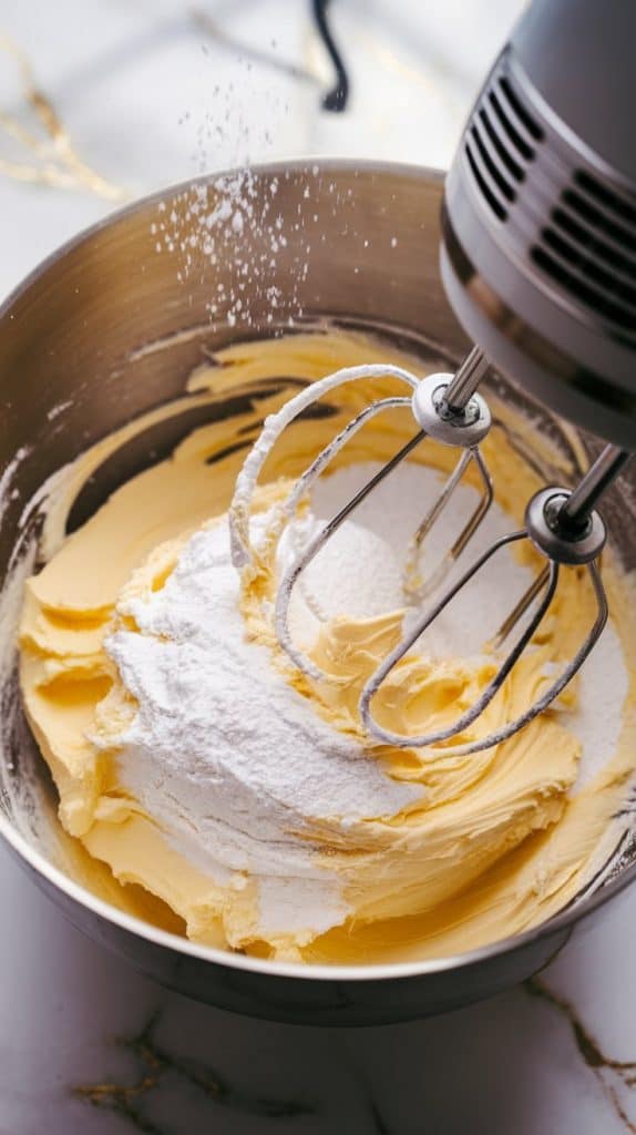 In a mixing bowl, beat the softened butter and powdered sugar together until light and fluffy.