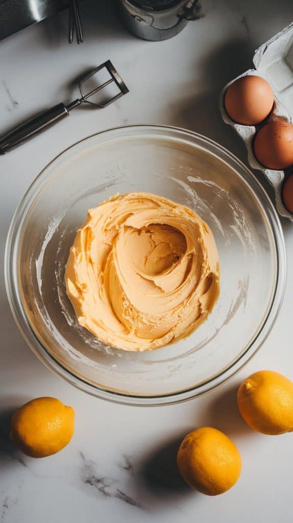 In a large bowl, beat the butter and sugar until light and fluffy (about 2-3 minutes). Add eggs one at a time, mixing well after each. Stir in vanilla extract and Meyer lemon zest.